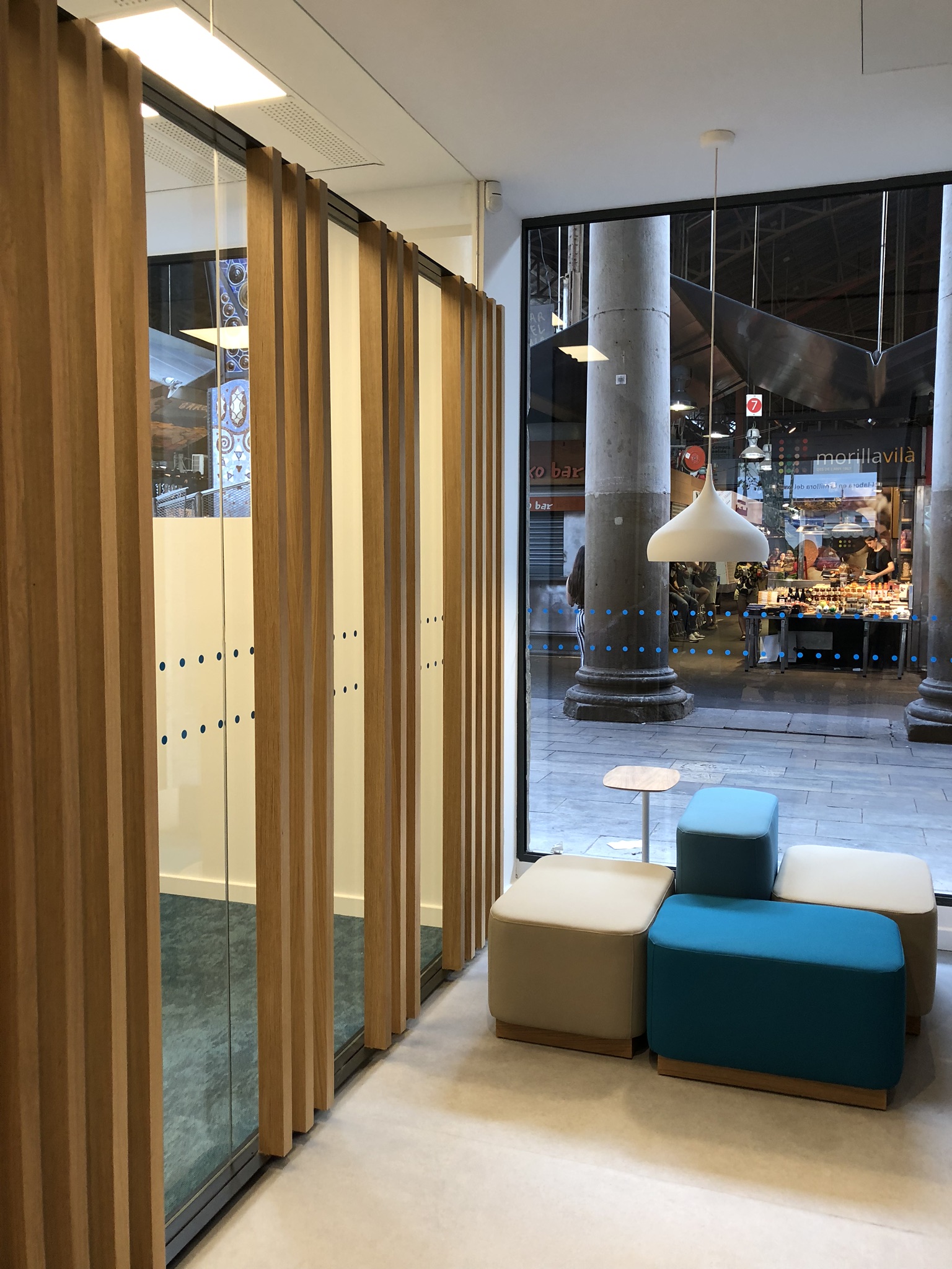 Oficina Bancaria Oficina bancaria Business ubicada en edificio catalogado del casco histórico de la ciudad, con un programa desarrollado en dos plantas junto al Mercat de la Boqueria de Barcelona.